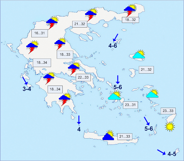 Τοπικοί όμβροι και καταιγίδες στο ΒΔ Αιγαίο. Άνεμοι Β-ΒΔ 4 με 6 μποφόρ. Θερμοκρασία από 21 έως 33 βαθμούς.