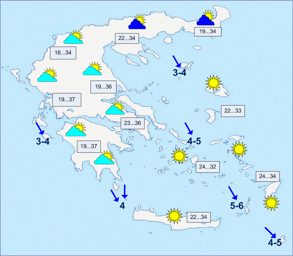 Ηλιοφάνεια. Άνεμοι ΒΔ 4 με 5 και πρόσκαιρα στα νοτιοανατολικά πελάγη 6 μποφόρ. Θερμοκρασία από 22 έως 34 βαθμούς.