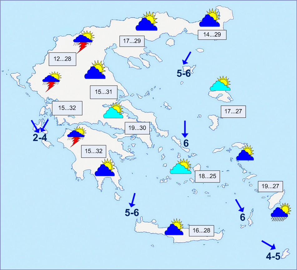 Η διάταξη των βαρομετρικών συστημάτων στη ΝΑ Ευρώπη με τις υψηλές πιέσεις στα Β. Βαλκάνια και τις χαμηλές πιέσεις στην Α. Μεσόγειο, η οποία ως γνωστόν ευνοεί την επικράτηση Β-ΒΑ ανέμων στη χώρα μας, θα διατηρηθεί και τις επόμενες 3-4 ημέρες. Στο διάστημα αυτό τοπικοί όμβροι και μεμονωμένες καταιγίδες θα σημειωθούν και πάλι στη Δ-ΒΔ Ελλάδα και τη Μακεδονία, όπου οι άνεμοι θα είναι γενικά ασθενείς. Η θερμοκρασία θα φθάσει τους 32 βαθμούς. Σε ό,τι αφορά τις πρώτες ημέρες της επόμενης εβδομάδας τα νέα στοιχεία στην εξέλιξη του καιρού θα είναι η εξασθένηση των βόρειων ανέμων και η μικρή περαιτέρω άνοδος της θερμοκρασίας. Η θερμική αστάθεια, που οδηγεί στην εκδήλωση των απογευματινών καταιγίδων, θα περιοριστεί βασικά στα ορεινά της ηπειρωτικής Ελλάδας.