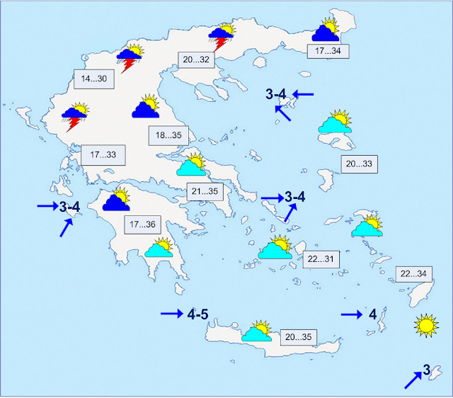 Τοπικές καταιγίδες το απόγευμα στην Ήπειρο και την ορεινή Δ. Στερεά. Άνεμοι Δ-ΝΔ 3 με 4 μποφόρ. Θερμοκρασία από 16 έως 34 βαθμούς.
