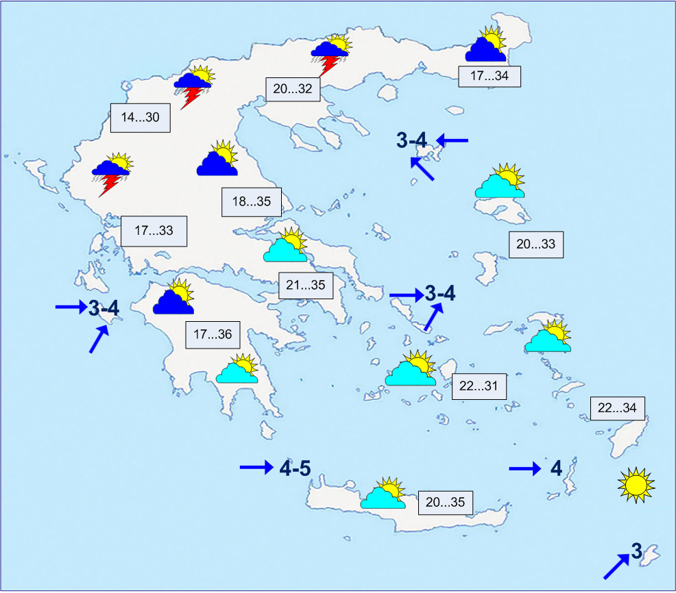 Τοπικές καταιγίδες το απόγευμα στην Ήπειρο και την ορεινή Δ. Στερεά. Άνεμοι Δ-ΝΔ 3 με 4 μποφόρ. Θερμοκρασία από 16 έως 34 βαθμούς.
