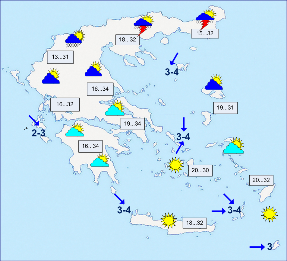 Τοπικές νεφώσεις το απόγευμα. Άνεμοι μεταβλητοί 2 με 3 μποφόρ. Θερμοκρασία από 14 έως 34 βαθμούς.