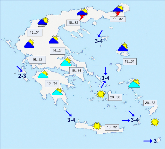 Τοπικοί όμβροι και καταιγίδες το απόγευμα κυρίως στην Α. Μακεδονία και τη Θράκη. Άνεμοι Α-ΒΑ 2 με 4 μποφόρ. Θερμοκρασία από 13 έως 33 βαθμούς.