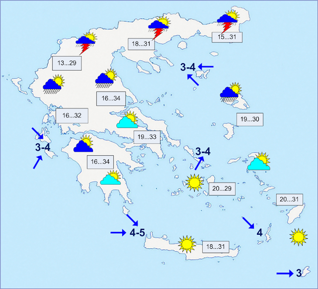 Πιθανοί όμβροι ή και καταιγίδες στο Β-ΒΑ Αιγαίο. Άνεμοι Δ-ΝΔ 3 με 5 μποφόρ. Θερμοκρασία από 17 έως 31 βαθμούς.