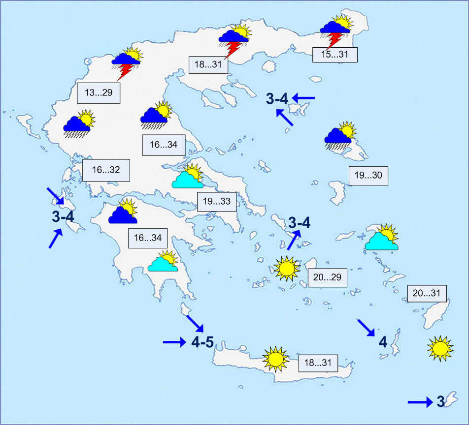 Πιθανοί όμβροι ή και καταιγίδες στο Β-ΒΑ Αιγαίο. Άνεμοι Δ-ΝΔ 3 με 5 μποφόρ. Θερμοκρασία από 17 έως 31 βαθμούς.