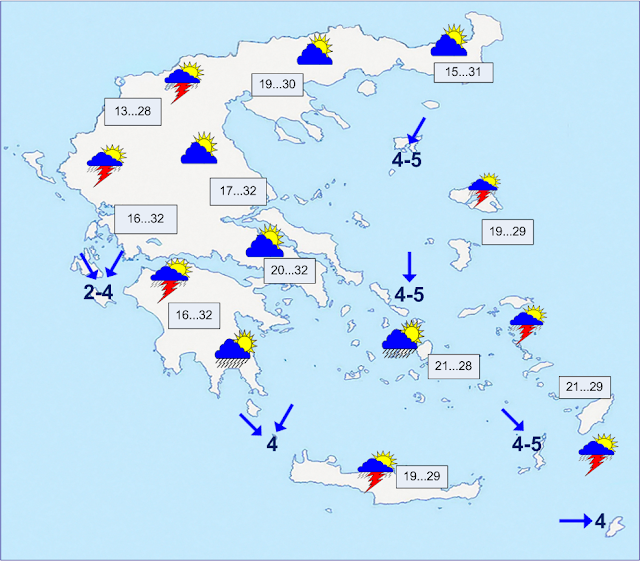 Τοπικοί όμβροι και καταιγίδες το απόγευμα στα ορεινά κυρίως της Ηπείρου. Άνεμοι ΒΑ έως ΒΔ 2 με 4 μποφόρ. Θερμοκρασία από 15 έως 32 βαθμούς.