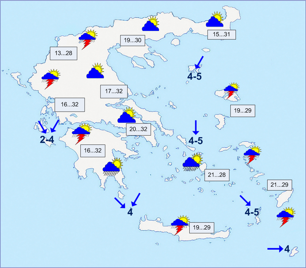 Τοπικοί όμβροι και καταιγίδες το απόγευμα στα ορεινά κυρίως της Ηπείρου. Άνεμοι ΒΑ έως ΒΔ 2 με 4 μποφόρ. Θερμοκρασία από 15 έως 32 βαθμούς.