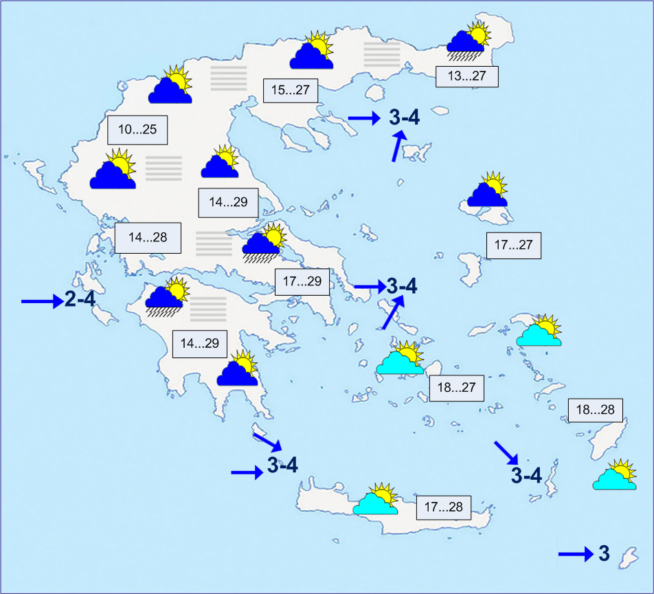 Πιθανές βροχές μικρής διάρκειας στην Α. Μακεδονία και τη Θράκη. Άνεμοι Δ-ΝΔ 2 με 4 μποφόρ. Θερμοκρασία από 10 έως 28 βαθμούς.