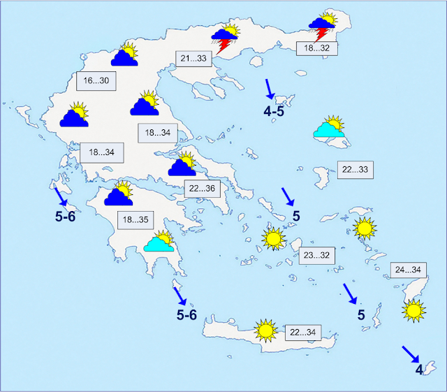Λίγες νεφώσεις στο Β-ΒΑ Αιγαίο. Άνεμοι Β-ΒΔ 4 με 6 μποφόρ. Θερμοκρασία από 22 έως 34 βαθμούς.