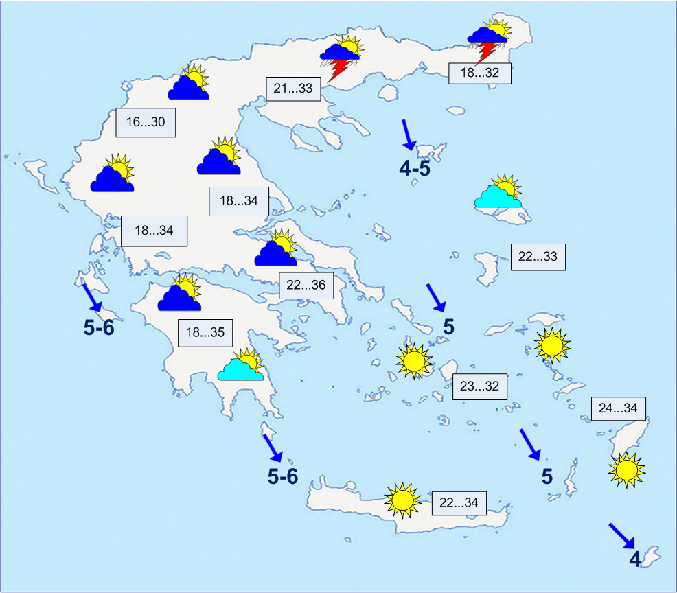 Λίγες νεφώσεις στο Β-ΒΑ Αιγαίο. Άνεμοι Β-ΒΔ 4 με 6 μποφόρ. Θερμοκρασία από 22 έως 34 βαθμούς.
