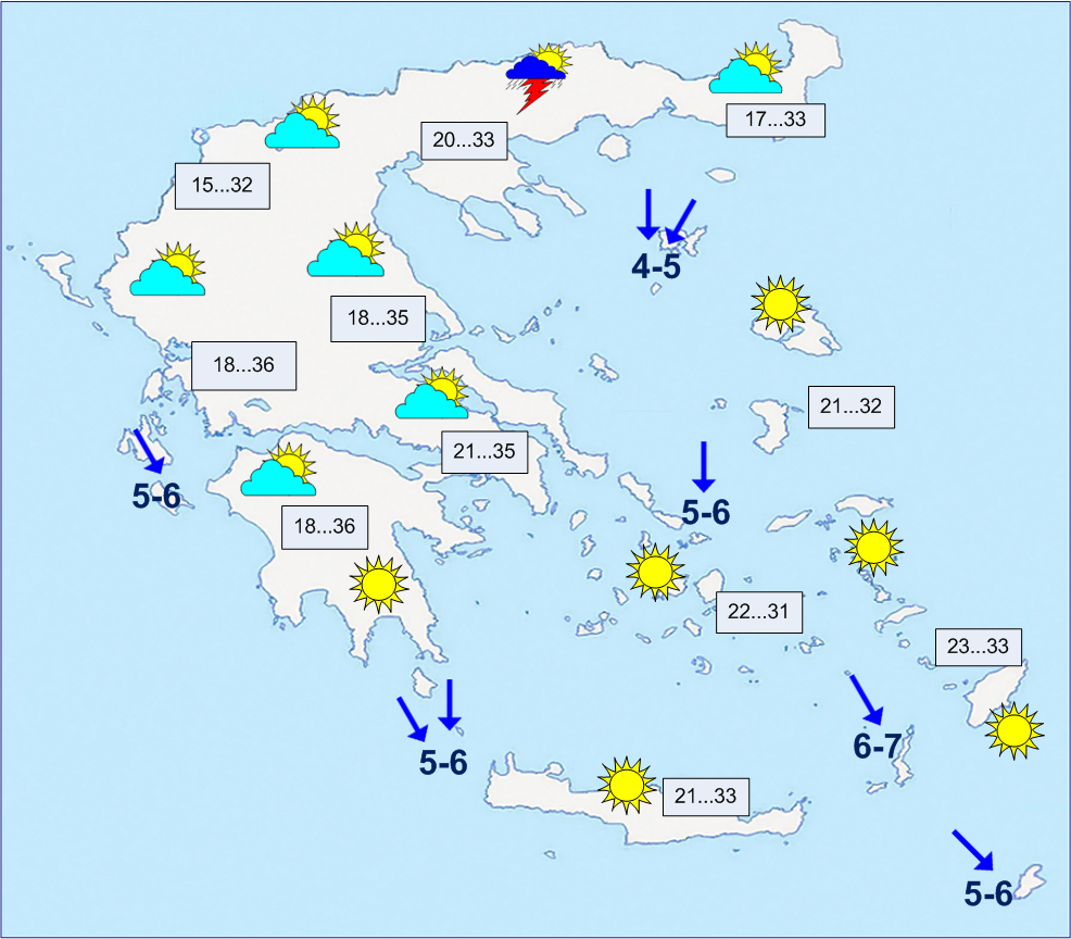 Ηλιοφάνεια. Άνεμοι Β-ΒΔ 3 με 5 μποφόρ. Θερμοκρασία από 21 έως 35 βαθμούς.